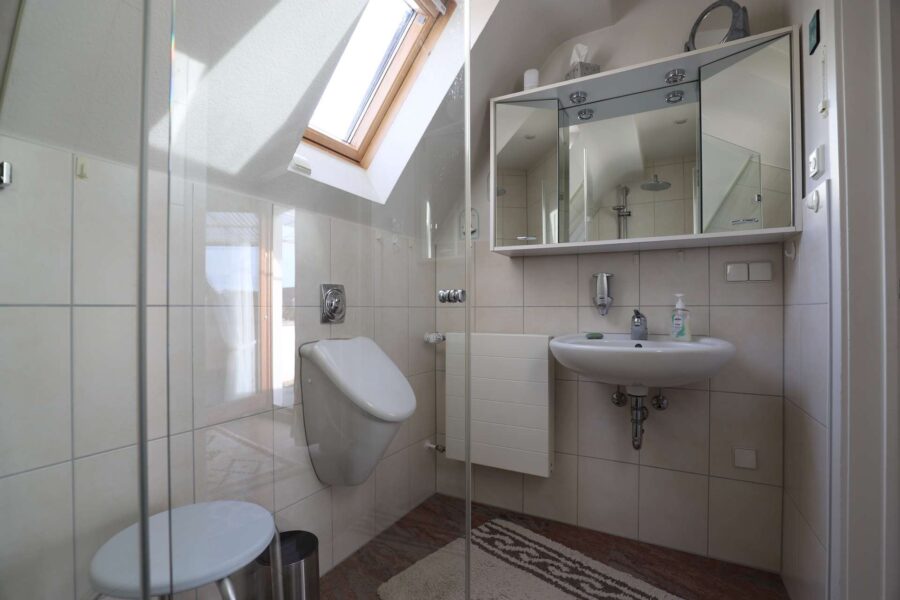 Das Dachgeschoss umfasst zwei gut geschnittene Schlafzimmer, die flexible Nutzungsmöglichkeiten bieten und sich sowohl als Schlaf-, Arbeits- oder Kinderzimmer eignen. Das im Jahr 2007 modernisierte Badezimmer ist funktional ausgestattet und verfügt über eine moderne Dusche mit Glasabtrennung sowie über ein Fenster für eine natürliche Belüftung. Angrenzend daran befindet sich ein überdachter Balkon, mit großzügiger Fläche, um viele Sonnenstunden zu genießen.