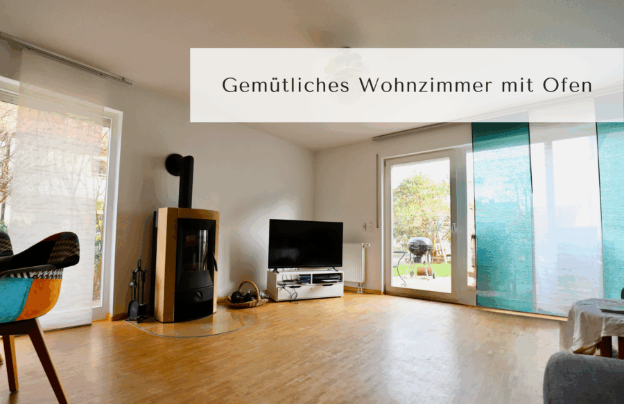 - Helles Wohnzimmer mit Holzofen und Echtholz-Stäbchenparkett