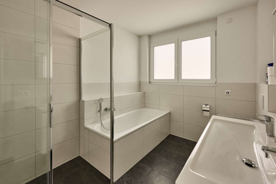 Die Wohnung verfügt über ein elegantes Hauptbad mit Badewanne und bodengleicher Dusche sowie ein separates Gäste-WC. Der robuste Vinylboden in Holzoptik und die zeitlos weißen Wände sorgen für eine neutrale, stilvolle Grundgestaltung.