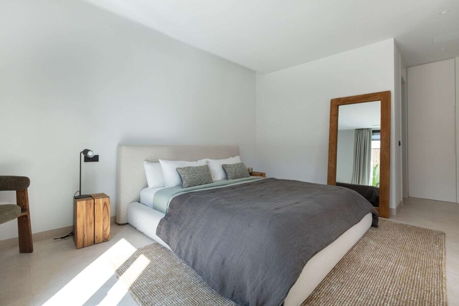 Praktikabilität ist gleichermaßen durchdacht: Einbauschränke in den Schlafzimmern und im Wohnbereich sorgen für viel Stauraum, ohne die klare, moderne Ästhetik zu beeinträchtigen. Ein separater Hauswirtschaftsraum mit Waschmaschine und Trockner bietet zusätzlichen Komfort, während ein 13 m² großer Kellerraum weiteren Stauraum schafft. Für ganzjährigen Wohnkomfort sorgen Fußbodenheizung und Klimaanlage. Hochwertige Oberflächen wie Porzellanböden in Porcelanosa-Steinoptik sowie indirekte Beleuchtung verleihen der Wohnung eine besondere Eleganz. Ein Gemeinschaftspool rundet das Angebot ab. Parkplätze sowie das Mobiliar sind für 100.000 Euro zusätzlich zum Kauf verfügbar.