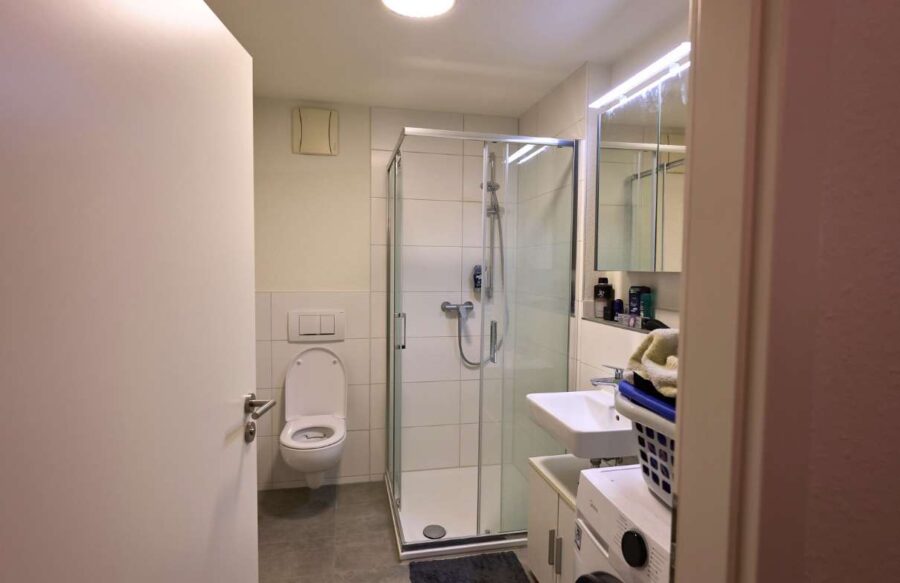 Das separate Badezimmer ist zeitlos gestaltet und mit einer Dusche, Waschbecken sowie WC ausgestattet.