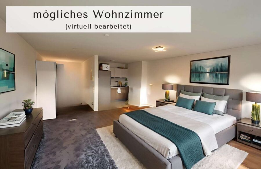 Der großzügige Wohn- und Schlafbereich bietet vielfältige Gestaltungsmöglichkeiten und bildet den zentralen Mittelpunkt der Wohnung. Von hier aus besteht ein direkter Zugang zum Balkon, der zusätzlichen Freiraum im Außenbereich bietet und sich ideal zum Entspannen eignet. Große Fenster sorgen für eine gute Belichtung und eine freundliche Wohnatmosphäre.