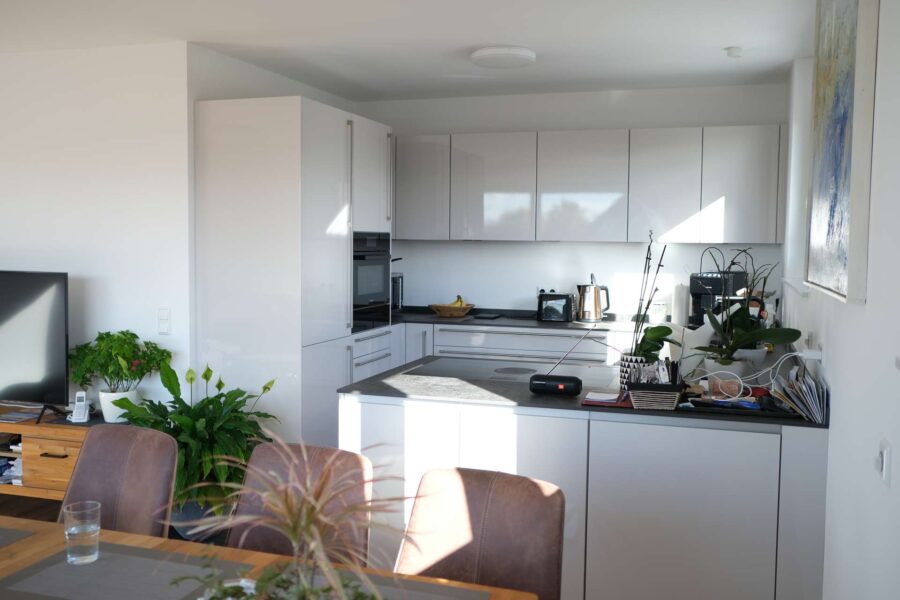 Der großzügige Wohn- und Essbereich mit offener Küche bildet das Herzstück der Wohnung. Eine große Schiebetür zur Dachterrasse sorgen für eine lichtdurchflutete, angenehme Atmosphäre. Die hochwertige Einbauküche (Wert ca. 31.000 €) ist modern gestaltet, perfekt in den Wohnbereich integriert und mit erstklassigen Markengeräten ausgestattet – sie ist bereits im Kaufpreis enthalten.