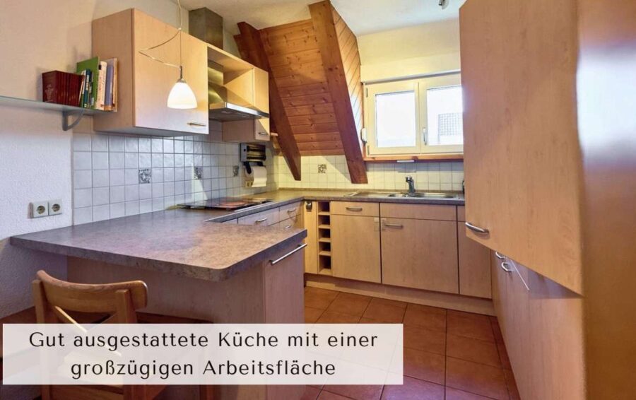 Die Küche ist mit einer großzügigen Arbeitsfläche ausgestattet und bietet ideale Bedingungen für eine komfortable und effiziente Alltagsgestaltung.